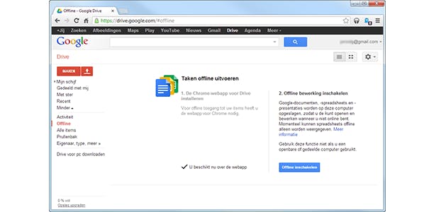 Nu gaan we je Google-documenten offline synchroniseren met de pc. Dat doe je door met Chrome naar http://drive.google.com te navigeren, in het linkermenu op Meer te drukken en op Offline. In het middengedeelte verschijnt nu het onderdeel Taken offline uitvoeren. Als het goed is staat er een vinkje bij het onderdeel U beschikt nu over de webapp omdat we deze in de eerste stap hebben uitgevoerd.