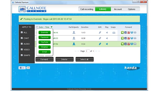 Naast gesprekken opnemen, kan een gesprek ook worden gepubliceerd op Facebook, Evernote, Dropbox en YouTube. Open het tabblad Account en klik op de dienst die je wilt gebruiken (bijvoorbeeld Evernote). Klik op Connect, meld je aan en druk op Authorize. Om gesprekken te delen ga je naar het tabblad Library, hier worden alle opnames bewaard die je hebt gemaakt.