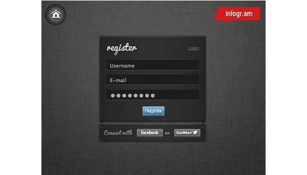 Open je browser en surf naar www.infogr.am. Om gebruik te kunnen maken van deze dienst, moet je je eerst even gratis registreren. Klik op Start now, it's free om de registratieprocedure te starten. Voer je e-mailadres en wachtwoord in en klik op de blauwe Register-knop. Je kunt je ook aanmelden met je Facebook- of Twitter-account.