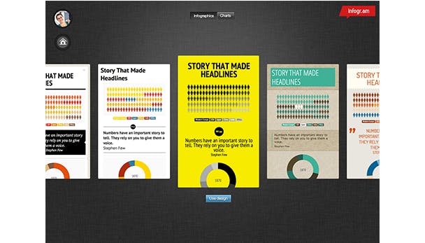 Eenmaal ingelogd, krijg je drie grote knoppen te zien: Create, Library en Upgrade to Pro. Kies Create om een infografiek te maken. In de standaardversie krijg je toegang tot zes verschillende sjablonen. Kies de vormgeving die je het leukst vindt en bevestig met de Use design-knop.