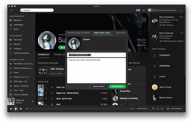 Allereerst zoek je in Spotify naar een artiest door bovenin het scherm te zoeken. Klik op de naam van de artiest en klik op de drie rondjes naast de artiestennaam. Om deze artiest te delen, kies je voor Delen en in het volgende scherm klik je op Versturen naar. Omdat je Spotify-account aan je Facebook-account is gekoppeld, verschijnen hier alleen je Facebook-vrienden met een Spotify-account. Geef eventueel een korte tekst in bij Zeg iets over deze artiest en klik op Versturen. Hetzelfde stappenplan geldt bij het delen van een album of lied.