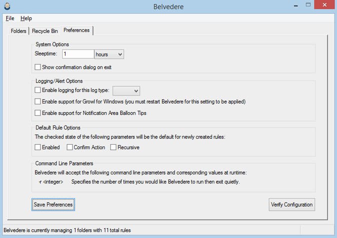 Download en installeer Belvedere. Start Belvedere en ga naar het tabblad Preferences. Zet Sleeptime op minimaal 1 hour (of langer). Hiermee zal Belvedere één keer per uur je downloadmap controleren. Bewaar je instellingen met Safe preferences. Ga naar het tabblad Folders en klik linksonder op het plusteken. Wijs je downloadmap aan, deze map verschijnt met de titel Downloads in de linkerkolom.