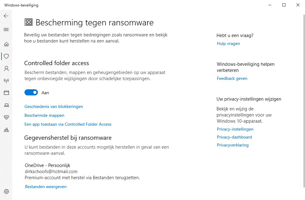 De functie Gecontroleerde maptoegang houdt apps in de gaten die wijzigingen aan de bestanden in bepaalde mappen proberen aan te brengen. Wanneer een app een bestand in een beveiligde map probeert aan te passen, wordt dit geblokkeerd en ontvang je een melding van deze verdachte activiteit. Om deze anti-ransomwarefunctie in te schakelen, open je Instellingen / Privacy en beveiliging / Windows-beveiliging en dan klik je op Virus- en bedreigingsbescherming. Scrol naar beneden tot je bij Bescherming tegen ransomware komt en klik op de optie Bescherming tegen ransomware beheren. Daar zet je de schakelaar bij Controlled folder access aan.