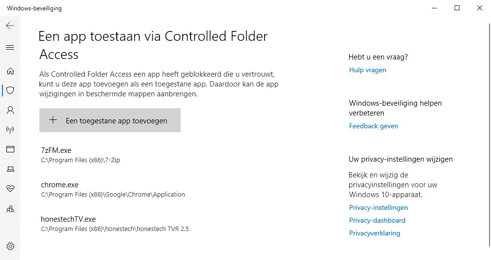 Natuurlijk wil je niet geblokkeerd worden als je zelf een document in een bepaalde map wijzigt. Daarom klik je op de optie Een app toestaan via Controlled Folder Access. Daarna kun je via de knop Een toegestane app toevoegen de apps selecteren die bestanden mogen aanpassen zonder dat het alarm afgaat. Hiervoor navigeer je naar de apps op de harde schijf of je selecteert een app die door deze beveiligingsfunctie onlangs werd geblokkeerd. Standaard beschermt Gecontroleerde maptoegang de mappen Documenten, Afbeeldingen, Video’s en Bureaublad. Je kunt deze mappen niet uit de beschermlijst verwijderen, maar je kunt wel extra locaties toevoegen die beschermd moeten worden. Hiervoor gebruik je in het venster Bescherming tegen ransomware de knop Beschermde mappen. Zodra je deze stappen hebt afgerond, zal de maptoegangscontrole zijn werk doen.