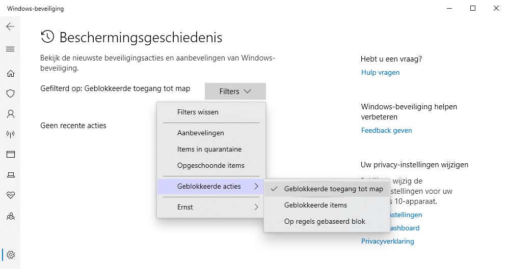 In hetzelfde venster vind je de Geschiedenis van blokkeringen. Hier zie je wanneer er voor het laatst een scan is uitgevoerd en hoeveel bedreigingen er op dat moment zijn aangetroffen. Dit venster is hetzelfde scherm als de beschermingsgeschiedenis van Microsoft Defender Antivirus. Hier kun je een filter toepassen om alleen de geschiedenis te bekijken van Gecontroleerde maptoegang. Stel daartoe het filter in op Geblokkeerde toegang tot map. Wil je de beveiliging alsnog uitschakelen, ga dan opnieuw naar Virus- en bedreigingsbescherming en klik op de link Bescherming tegen ransomware beheren onder Bescherming tegen ransomware. Daarna zet je de schakelaar bij Controlled folder access uit.