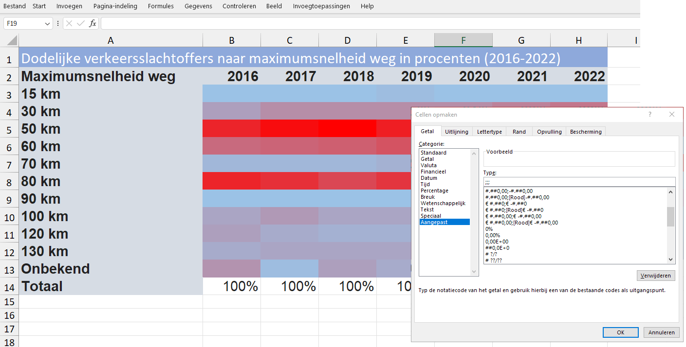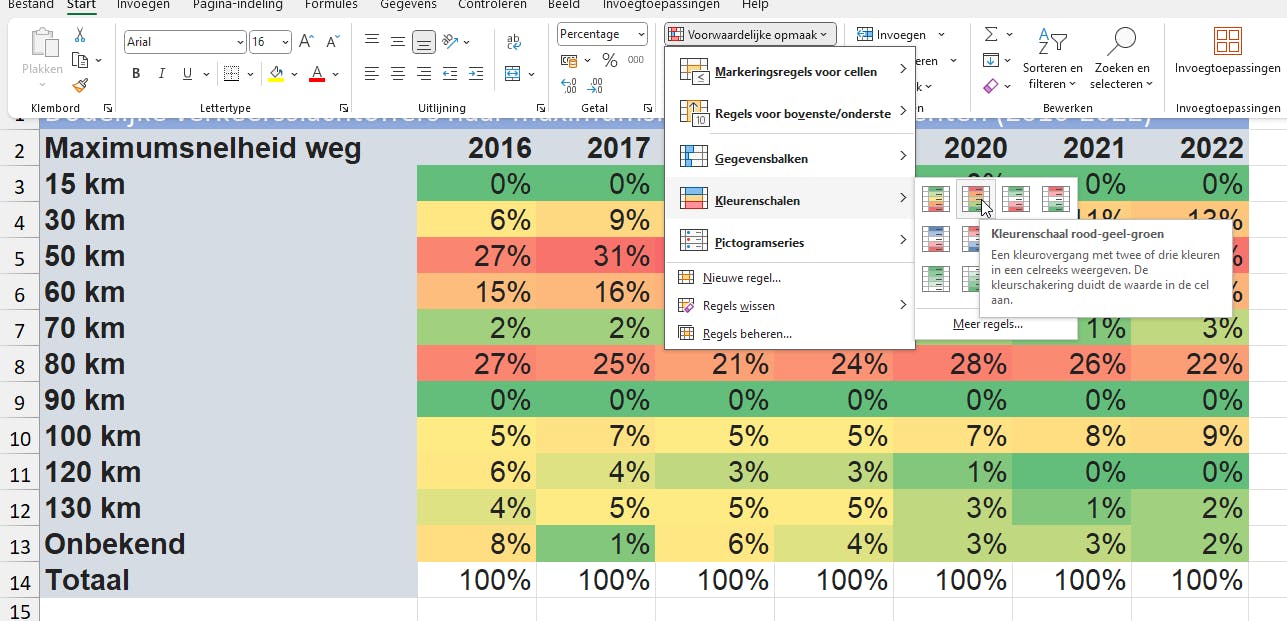 Selecteer de kleurenschaal die je wilt gebruiken. In ons voorbeeld gebruiken we een tabel van verkeersslachtoffers, afhankelijk van de maximumsnelheid op de plek van het ongeval (bron: Rijkswaterstaat). Omdat een hoog cijfer in dit geval kritiek is, kiezen we voor een kleurschaal waarbij de hoge waarden rood en de laagste waarden groen zijn. In een oogopslag zie je hoe de zaken ervoor staan.