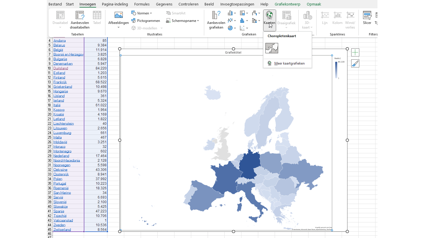 Met geografische gegevens kun je de heatmap een extra dimensie geven. Hiermee verschijnen de waarden op de locaties als kleur gecodeerde indicatoren. Selecteer eerst de gegevens en neem daarin de locatienamen mee. In dit voorbeeld hebben we de landen van Europa opgesomd en in de tweede kolom staat het aantal inwoners x1000. Nadat je de dataset hebt geselecteerd, ga je naar het tabblad Invoegen. Daar selecteer je Kaarten en daaronder kies je de optie Choropletenkaart. Met de choropletenkaart kun je de waarden vergelijken tussen regio’s en landen. Wanneer het kaartdiagram in beeld komt, zie je de waarden weergegeven met kleuren.