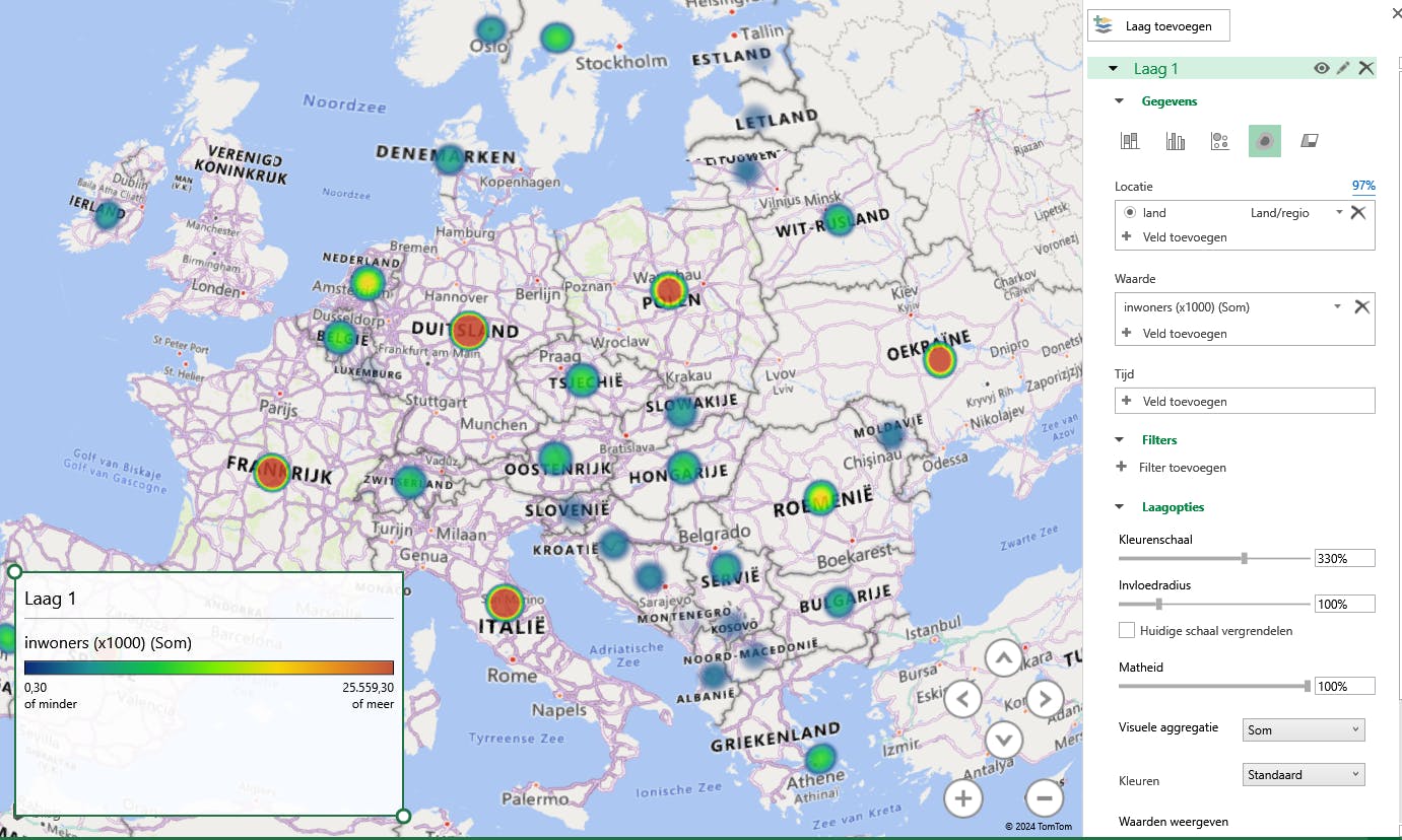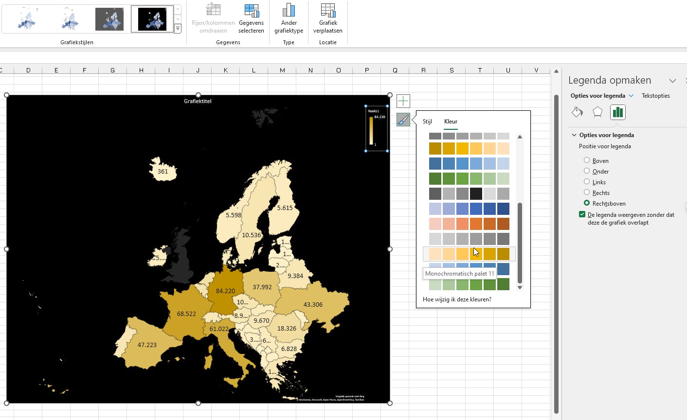 In dit voorbeeld zijn de gegevenslabels het aantal inwoners per land. Als je de gegevenslabels in beeld hebt gebracht, kun je op zo’n label klikken en het lettertype, de lettergrootte en letterkleur in het tabblad Start aanpassen. Als je de opmaak van één label wijzigt, nemen de andere labels deze opmaak vanzelf over. Klik je op de penseelknop naast de kaart, dan kun je de stijl van de kaart en de kleurenschaal van de heatmap aanpassen.