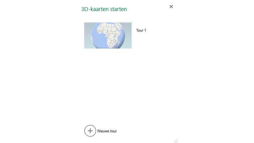 Excel heeft ook een optie om in 3D een geografische hittekaart te maken met geavanceerde opties. Het resultaat is een 3D-wereldbol die je kunt roteren en waarop je kunt inzoomen. Begin met de gegevens te selecteren van de kaart, inclusief de locatienamen en de kolom- en rijkoppen. Daarna ga je naar het tabblad Invoegen en in de groep Rondleiding klik je op de knop 3D-kaart en vervolgens op 3D-kaart opencelen. Als je op deze manier ooit een 3D-kaart hebt gemaakt, dan kun je die nu selecteren. Wil je een nieuwe presentatie maken, dan klik je onderaan dit menu op de plusknop en kies je Nieuwe tour.