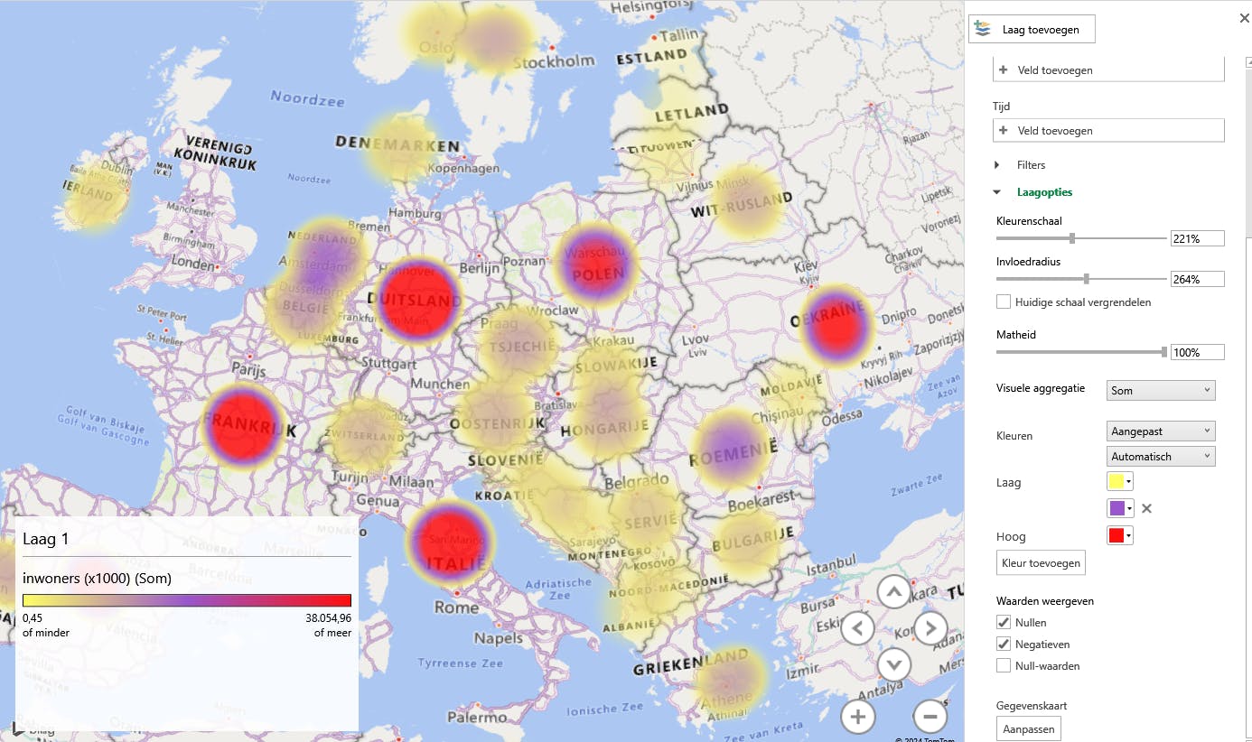 Vind je die gekleurde bubbels van de heatmap wat te klein? Ga dan in het rechterdeelvenster een beetje naar beneden en open de Laagopties. Met de schuifregelaar Invloedradius vergroot je de bubbels traploos en laat je ze zelfs in elkaar overlopen. Met de regelaar Kleurenschaal zorg je dat je duidelijker de kleurwaarden ziet. Ben je tevreden? Plaats dan een vinkje bij Huidige schaal vergrendelen.
