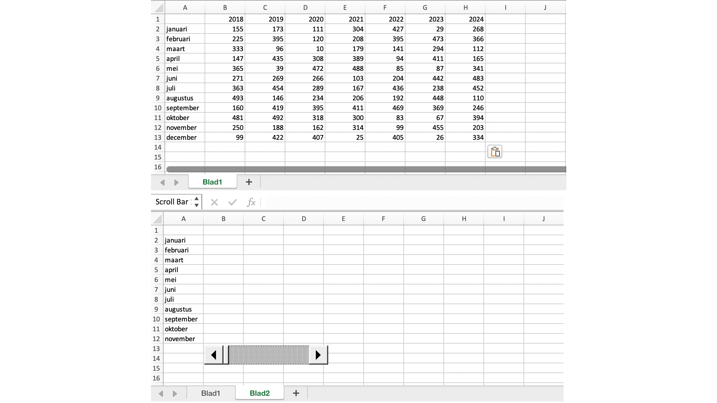 Vervolgens heb je het tabblad Ontwikkelaars nodig. Als dat tabblad bij jou niet in Excel te zien is, moet je dat nog toestaan in Bestand / Opties / Lint aanpassen. In het tabblad Ontwikkelaar klik je op het item Schuifbalk en daarna selecteer je de plaats waar je de schuifbalk wilt zien. Hier is die balk drie kolommen breed en komt hij onder de cellen waar de straks de gegevens zullen opgehaald worden.