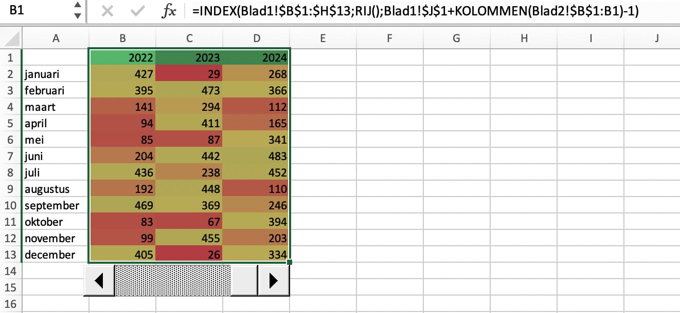 Een dynamische heatmap is een heatmap die een kleurencode toepast op data die het uit een ander Excel-blad ophaalt. Dit is vooral nuttig als de dataset op werkblad 1 veel gegevens bevat, terwijl je op werkblad 2 een dashboard wilt tonen waar je met een schuifbalkje door de volledige dataset kunt scrollen in een beperkte weergave.