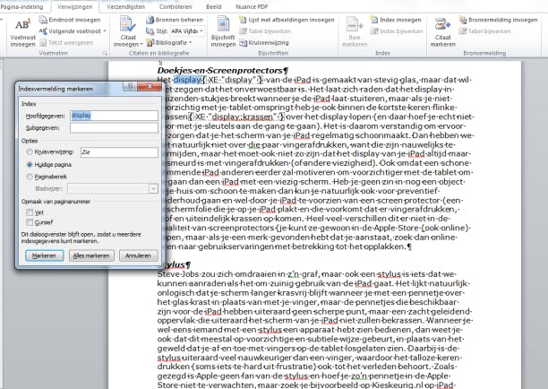Om te kunnen experimenteren met het genereren van een index, is het handig dat u een document hebt met veel informatie. Daarbij is het belangrijk om te weten dat een index een hoofdgegeven en een subgegeven kan hebben (zie dat als een hoofdcategorie en subcategorie). Zoek een woord in uw tekst dat relevant is en selecteer het. De tekst die wij als voorbeeld gebruiken gaat over de iPad, dus het woord iPad is niet relevant, want daar gaat de hele tekst over. Wij selecteren het woord display, want dat is wel relevant. Zodra u het woord hebt geselecteerd, klikt u in het lint op het tabblad Verwijzingen en vervolgens op de knop Item markeren (of gebruik de toetscombinatie Alt+Shift+X). Het venster Indexvermelding markeren verschijnt, met het geselecteerde woord ingevoerd. Klik op Markeren. Er verschijnt nu een code in de tekst die aangeeft dat het woord gemarkeerd is voor indexering. Het venster blijft open zodat u op alle woorden kunt klikken die u wilt indexeren.