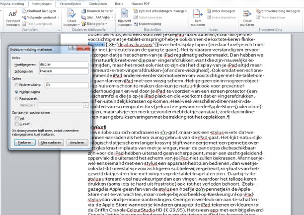 In de eerste stap hebben we een indexmarkering aangemaakt met een hoofdgegeven. Nu gaan we er eentje aanmaken met een subgegeven. Selecteer een relevant woord in de tekst, dat valt onder een hoofdcategorie. In onze tekst valt het woord krassen bijvoorbeeld onder de categorie display. In het venster Indexvermelding markeren wordt krassen automatisch bij Hoofdgegeven geplaatst, maar dat willen we niet. Kopieer die tekst (Ctrl+C) en plak het in het veld Subgegeven (Ctrl+V). Bij Hoofdgegeven vult u nu het woord display in, waarna u klikt op Markeren. Opnieuw wordt er een code ingevoegd achter het geselecteerde woord, maar ditmaal bestaande uit de twee woorden die u hebt ingevoerd. Schrik overigens niet van de andere codes (stipjes, tekens) die in te tekst verschijnen, Word is overgeschakeld naar de modus waarin codes voor de opmaak worden weergegeven. In het tabblad Start ziet u een omgekeerde P staan (¶), klik hierop om terug te schakelen naar de normale weergave of gebruik Ctrl+*.
