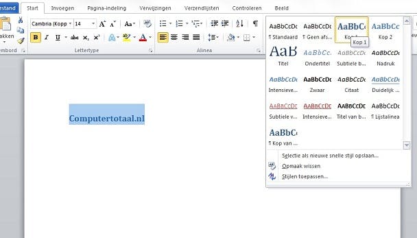 De kopjes moet je zien als een soort hiërarchie. De naam van je hoofdstukken deel je in onder Kop 1, je subkoppen onder Kop 2 en de eventueel tussenkopjes onder Kop 3. De opmaak van je titel zal dan veranderen in de opmaak van je gekozen kopstijl. Op deze manier kan Word lezen hoe het document is ingedeeld.