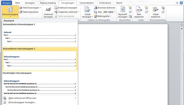 3. Als de gewenste stijl er al bij zit, kun je hier op klikken en deze direct invoegen. Als je echter nog wat aanpassingen wilt doen, ga je naar Inhoudsopgave invoegen. Hier kun je het aantal niveau's aangeven dat je wilt invoegen, paginanummers en andere opties.