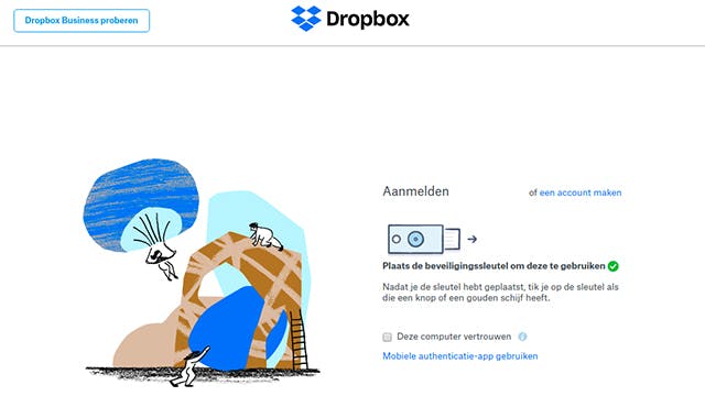 Zodra je tweefactorauthenticatie ingeschakeld hebt, kun je bij Beveiligingssleutels met een klik op Toevoegen je beveiligingssleutel toevoegen. Steek je beveiligingssleutel in de usb-poort van je computer en druk op de knop als Dropbox daarom vraagt. Als je nadien inlogt bij Dropbox, krijg je na het invoeren van je gebruikersnaam en wachtwoord de vraag om met een druk op de knop van je beveiligingssleutel te bevestigen dat jij het bent. Overigens kun je nog altijd de mobiele app of sms-code als tweede factor gebruiken als je je beveiligingssleutel niet bij je hebt.