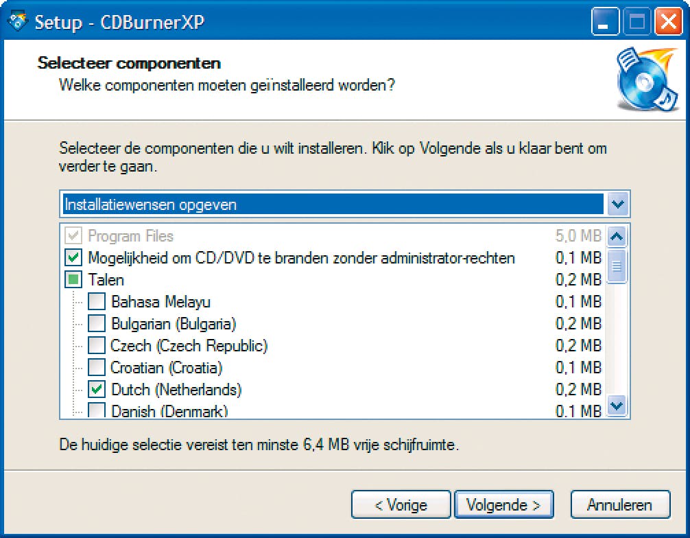 Begeef u eerst naar een pc die wél over een cd/dvd-station beschikt. Download en installeer daarop brandsoftware waarmee u de inhoud van een cd/dvd naar een image-bestand (bijvoorbeeld .iso) kunt branden. Een degelijk en gratis programma is bijvoorbeeld CDBurner-XP. Laat de naam u echter niet misleiden: de tool kan ook met dvd's overweg en werkt net zo goed onder Vista. De installatie vergt nauwelijks meer dan enkele keren op Volgende drukken. Let er wel op dat u (ook) Dutch (Netherlands) aanvinkt. Herstart voor de zekerheid de pc nadat de installatie is voltooid.