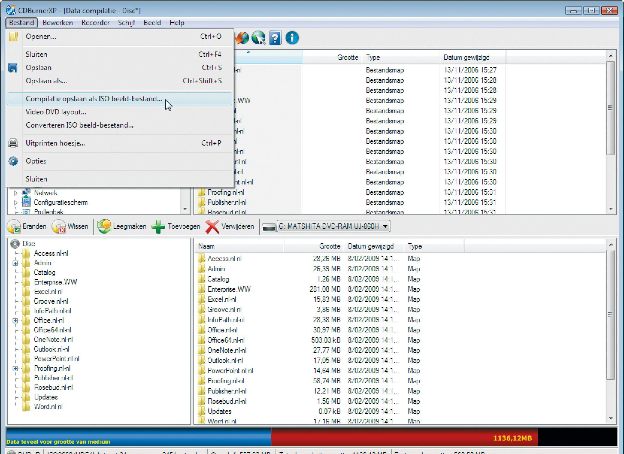 Start vervolgens CDBurnerXP op. In het hoofdmenu selecteert u de bovenste optie (Data schijf) en bevestigt u met OK. U belandt nu in het datacompilatie-venster van CDBurnerXP. Wanneer u nu het installatieschijfje in het station stopt, kunt u even later de bijhorende stationsletter uit het paneel linksboven met ingedrukte linkermuisknop naar het paneel rechtsonder slepen. CDBurnerXP voegt nu alle bestanden op dat schijfje aan uw compilatie toe. Dat kan eventjes duren. Na afloop opent u het menu Bestand en kiest u Compilatie opslaan als iso-beeldbestand. Navigeer naar een geschikte locatie, in dit geval een usb-stick, geef een naam aan het iso-bestand en bevestig met Opslaan.