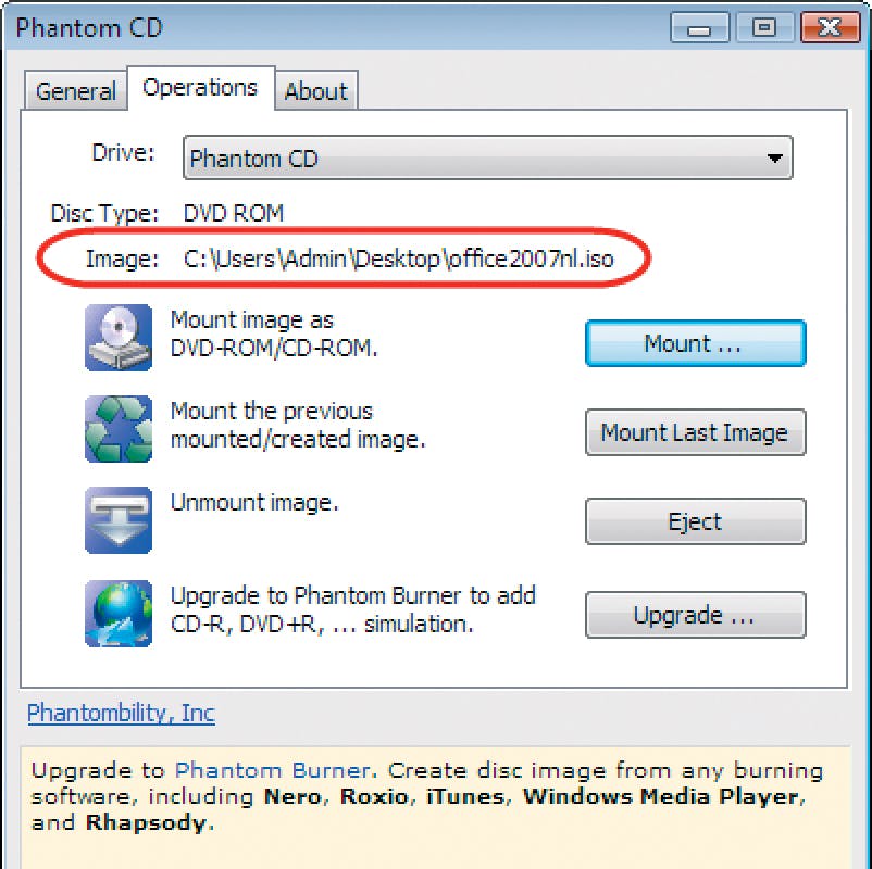 Start Phantom CD op via Alle programma's, Phantom CD Configuration. Open het tabblad Operations en druk op de knop Mount. Navigeer naar uw zojuist gecreëerde iso-bestand (op uw usb-stick; een image in een gedeelde netwerkmap wordt in deze versie van Phantom CD niet ondersteund), selecteer het bestand en druk op Openen. Phantom CD neemt het bestand nu op in zijn virtueel cd/dvd-station. U kunt dit station via de Verkenner bereiken, net als bij een fysiek cd/dvd-station. Nu staat niets nog de installatie van het gewenste softwarepakket in de weg. Succes!