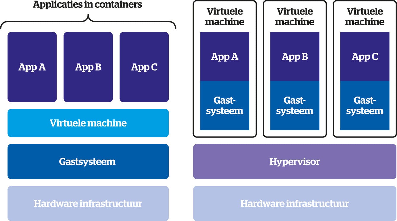 Applicaties in Docker-containers daarentegen gebruiken evenveel werkgeheugen als deze zonder container nodig zouden hebben, wat maakt dat je vaak probleemloos verschillende containers tegelijk op een doorsnee computer kunt draaien. Elke container draait in een volledig afgescheiden, virtueel bestandssysteem met alleen de nodige software en afhankelijkheden. Dit maakt dat je containers moeiteloos kunt migreren en desgewenst kunt verwijderen zonder sporen na te laten. Containers zijn doorgaans dus efficiënter, draagbaarder en veiliger dan virtuele machines.