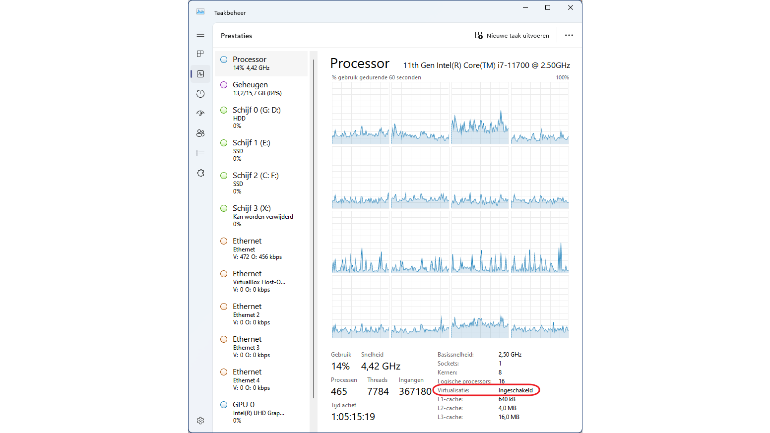 De machine moet ten minste 4 GB geheugen hebben en een 64bit-processor met SLAT-ondersteuning (Second Level Address Translation, een specifieke hardware-virtualisatietechnologie, bij AMD vaak RVI genoemd en bij Intel Core-processors EPT). In het UEFI/BIOS moet hardware-virtualisatie ook daadwerkelijk zijn ingeschakeld, vaak aangeduid als AMD-V of VT-X. Je kunt dit snel controleren door in Windows op Ctrl+Shift+Esc te drukken, het tabblad Prestaties te openen en op Processor te klikken. Bij Virtualisatie moet Ingeschakeld worden weergegeven. Neem desnoods je systeemhandleiding door voor eventuele aanpassingen aan het systeem-BIOS.