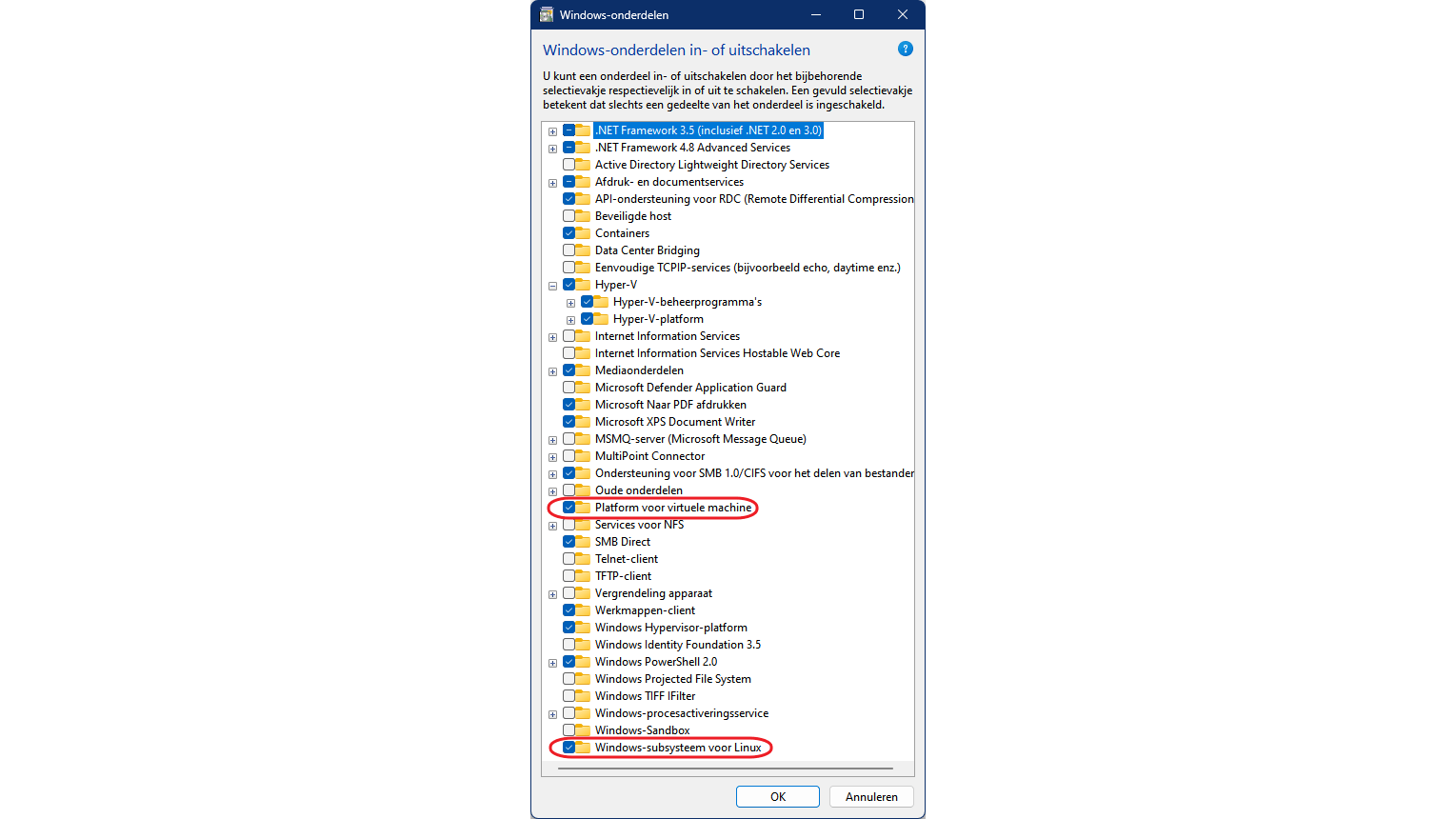 Controleer daarnaast het volgende: druk op de Windows-toets+R en voer optionalfeatures uit. In het venster Windows-onderdelen in- of uitschakelen zorg je er dat zowel Platform voor virtuele machine als Windows-subsysteem voor Linux is aangevinkt. Bevestig met OK en herstart indien nodig je systeem.