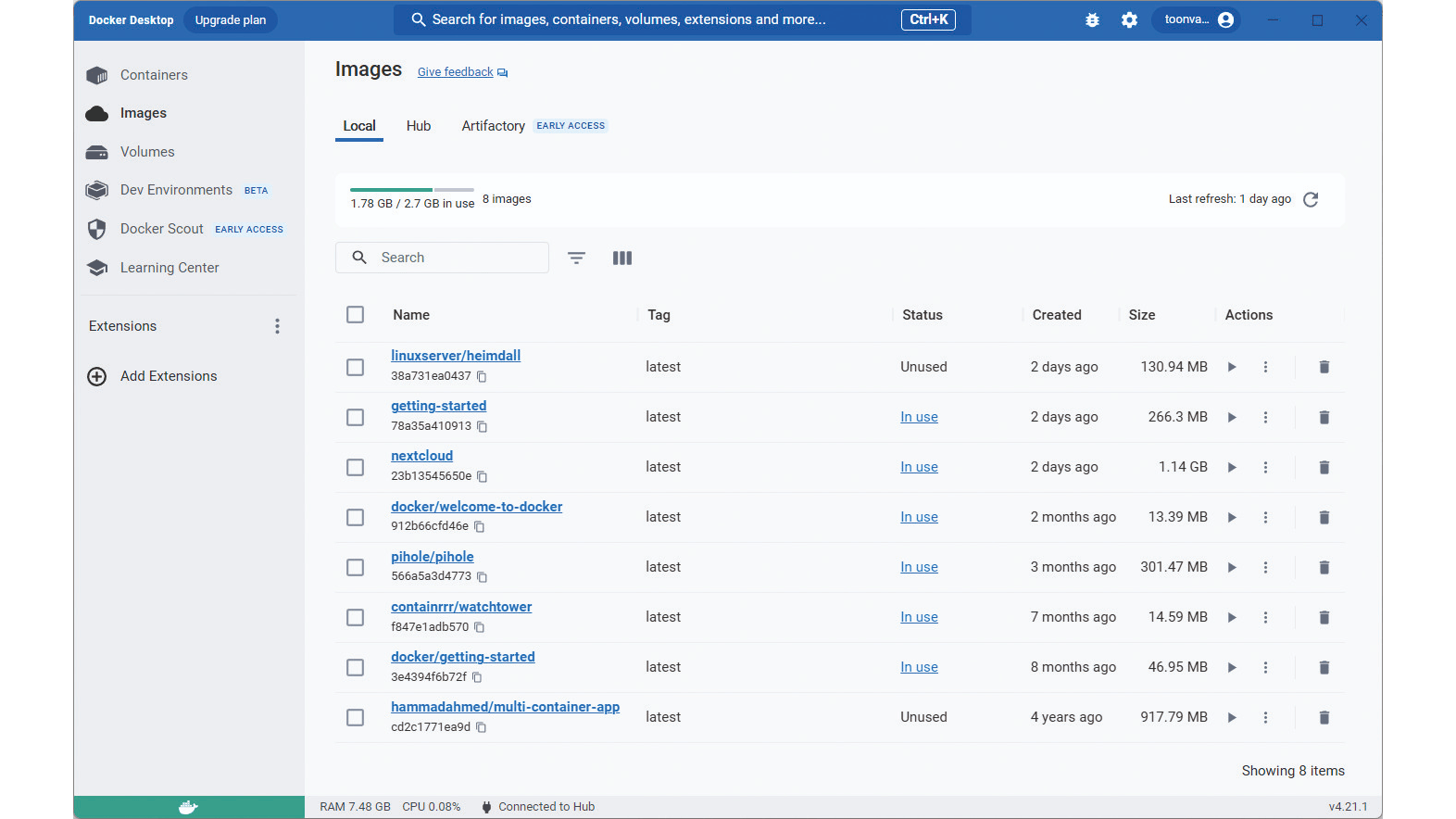 • Extensions: verschillende extensies om de functionaliteit van Docker Desktop uit te breiden.