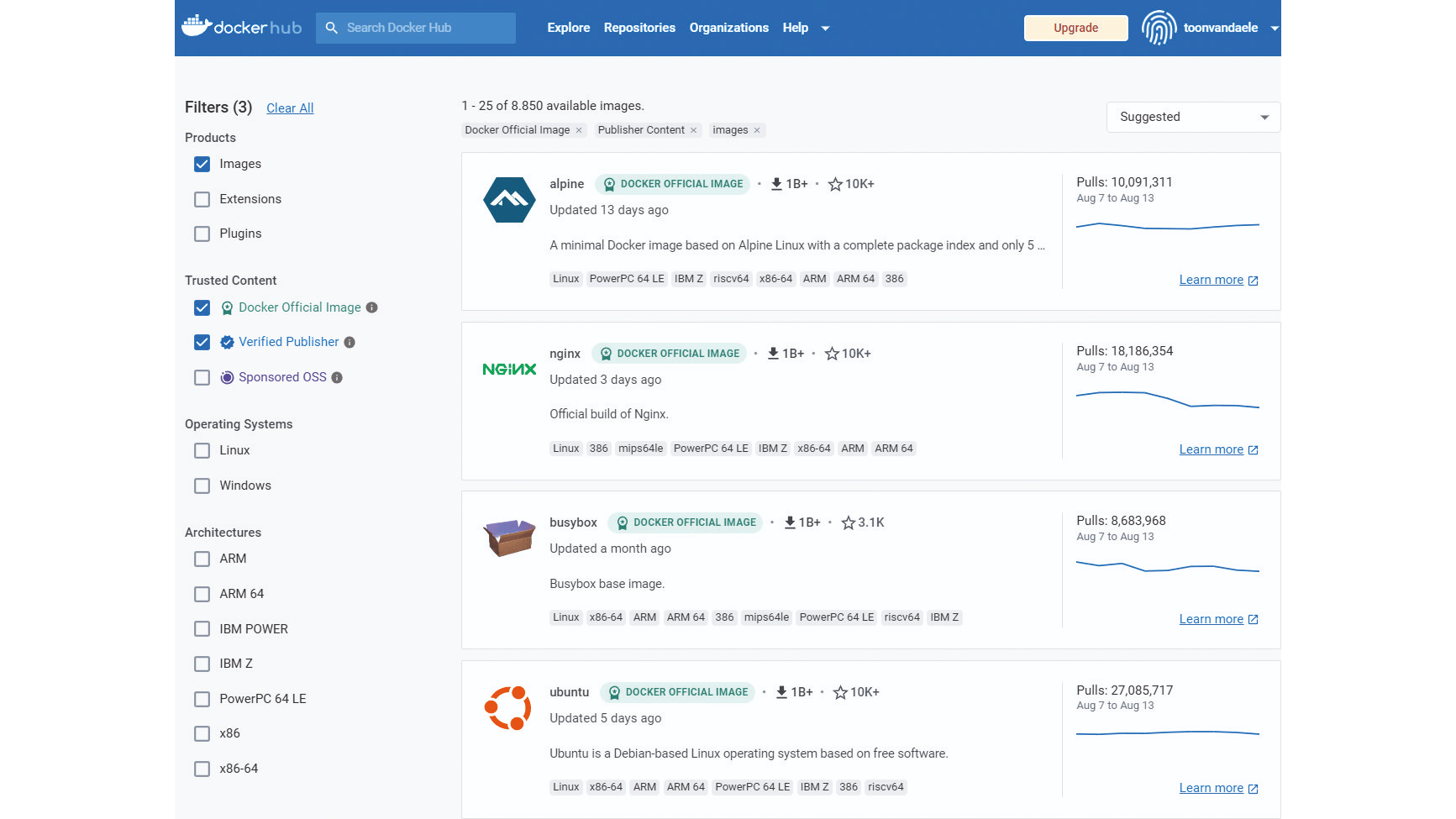 Terug in Docker Hub kun je op Explorer klikken en zoekfilters gebruiken. De combinatie Images en Docker Official Image bijvoorbeeld levert ongeveer 180 resultaten op. Als je ook het filter Verified Publisher toevoegt, vind je bijna aan 9000 images. Uiteraard kun je ook je eigen zoektermen in de zoekbalk invoeren.