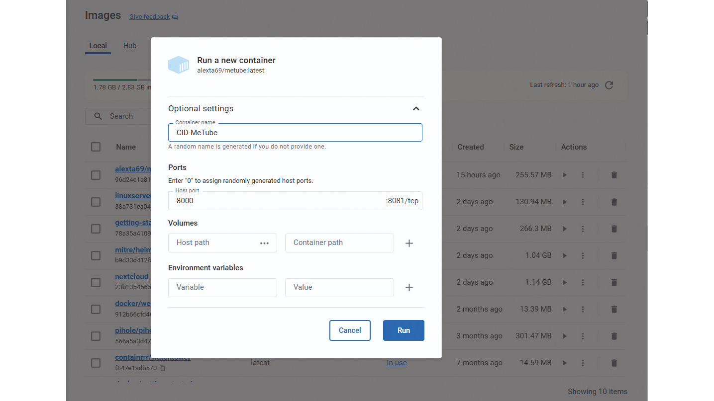 Om een image uit te voeren en om te zetten naar een (potentieel) actieve container, hoef je in principe alleen maar op het pijlknopje te klikken naast het gewenste image en nogmaals te bevestigen met Run. Je krijgt in het getoonde venster echter de kans om een of meer instellingen aan te passen onder Optional settings. Dit omvat vaak een Container name (als je geen naam invoert, zal Docker er automatisch een genereren), de Host port, eventuele volumes en omgevingsvariabelen. Nadat je hebt bevestigd, vind je het image terug als een actieve container onder de opgegeven naam.