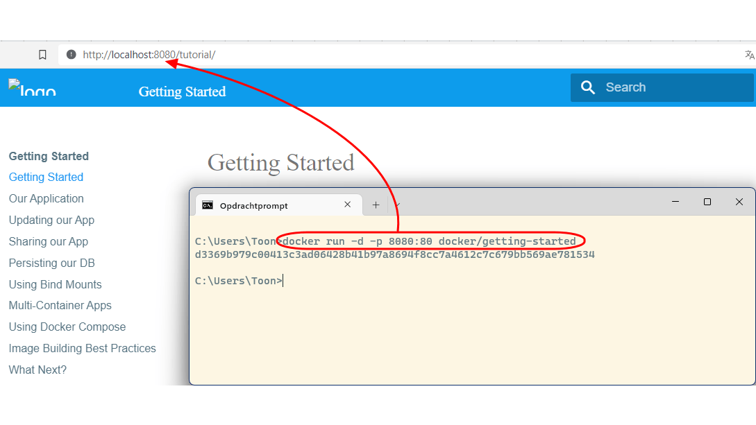 In dit geval is docker/getting-started de naam van het image. Met de parameter -d (detached) start je de container in de achtergrond en met -p 80:80 koppel je poort 80 van je Windows-pc (de hostmachine) aan de standaardpoort 80 van de container. Dit betekent dat je simpelweg http://localhost in je browser kunt invoeren (aangezien poort 80 de standaard http-poort is). Als je bijvoorbeeld -p 8080:80 had gebruikt, zou je http://localhost:8080 moeten invoeren als adres.