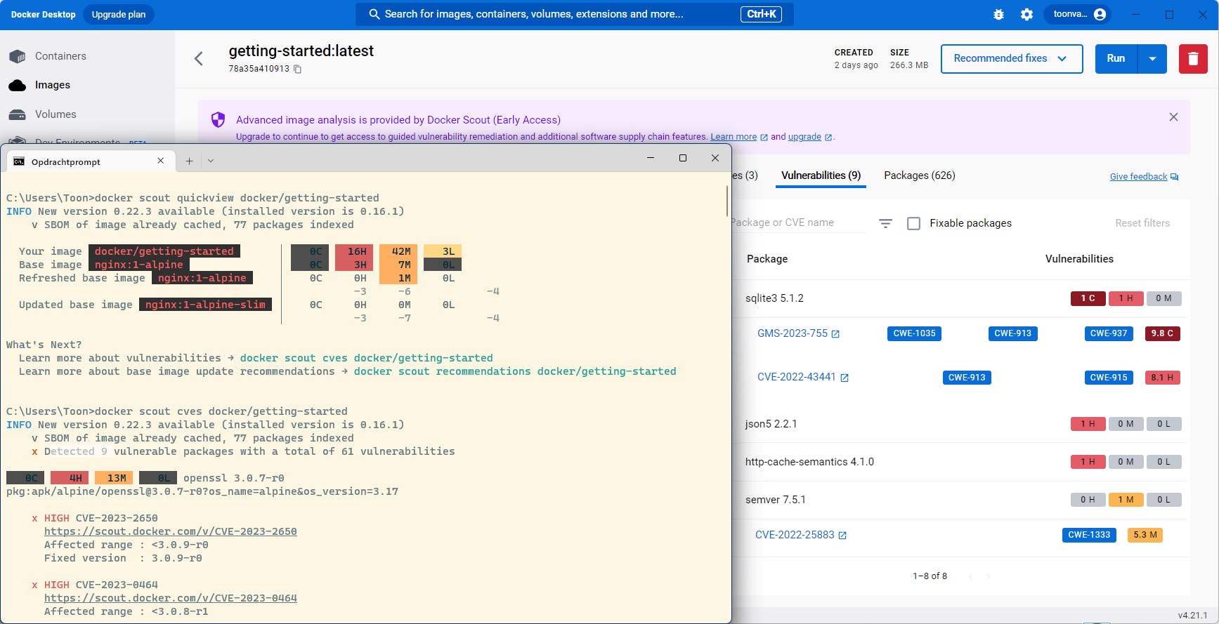 • Docker Scout: voor analyses van gedownloade images, inclusief veiligheidsanalyse;