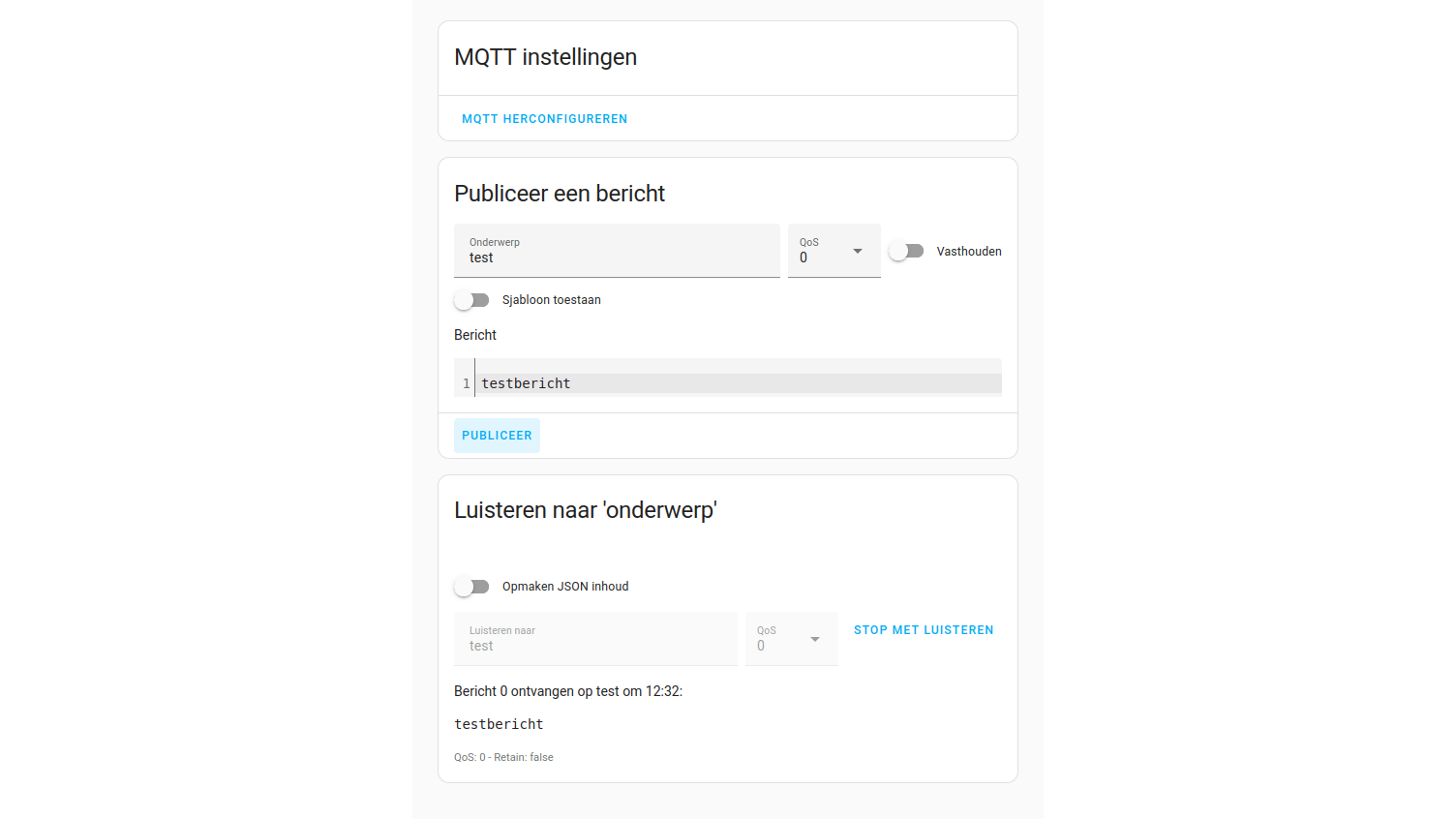 Daarna zie je in je lijst met integraties Mosquitto broker staan van het type MQTT. Klik op Configureer. Test nu of de verbinding correct werkt. Vul daarvoor onderaan bij Luisteren naar ‘onderwerp’ in het tekstveld voor het onderwerp test in en klik ernaast op Begin met luisteren. Vul dan bovenaan bij Publiceer een bericht bij het onderwerp eveneens test in, en bij het bericht testbericht. Klik op Publiceer. Als onderaan je testbericht verschijnt, weet je dat de verbinding met de MQTT-broker werkt.