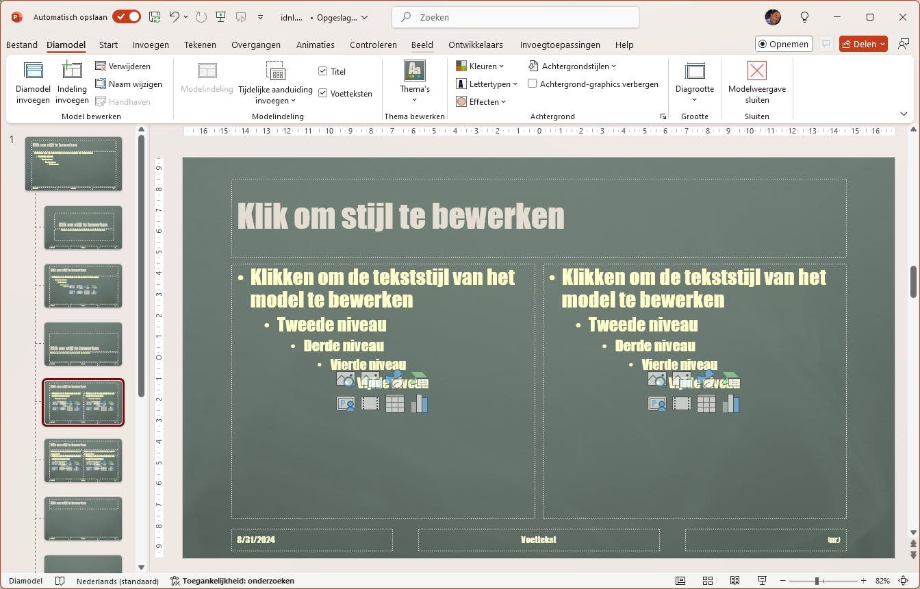 Om te voorkomen dat je de kleuren, het lettertype of de stijl van meerdere dia’s in je PowerPoint-presentatie moet aanpassen, werk je het best met een diamodel. Wijzigingen die je hierin aanbrengt, worden automatisch toegepast op alle dia’s. Open het menu Beeld en selecteer Diamodel bij Modelweergaven. Kies het hoofdmodel bovenin het linkerdeelvenster (ondersteunde lay-outs staan hieronder) en pas dit aan. Je wijzigingen worden doorgevoerd naar de onderliggende lay-outs. Als je nu Beeld / Normaal kiest en Nieuwe dia selecteert, hoef je alleen de gewenste lay-out te selecteren.