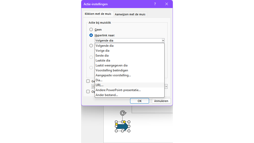 Een hyperlink invoegen is eenvoudig: kies Invoegen / Koppeling, selecteer Bestaand bestand of webpagina en vul de url in het Adres-veld in. Je kunt ook een link aan een object koppelen, zoals een eigen actieknop. Kies Invoegen / Vormen en selecteer bij Actieknoppen een vorm. Teken een kader, selecteer het, open het tabblad Invoegen en kies Actie. In het venster Actie-instellingen selecteer je op het tabblad Klikken met de muis en/of Aanwijzen met de muis bij Hyperlink naar de gewenste optie, zoals Dia, URL of Andere PowerPoint-presentatie.
