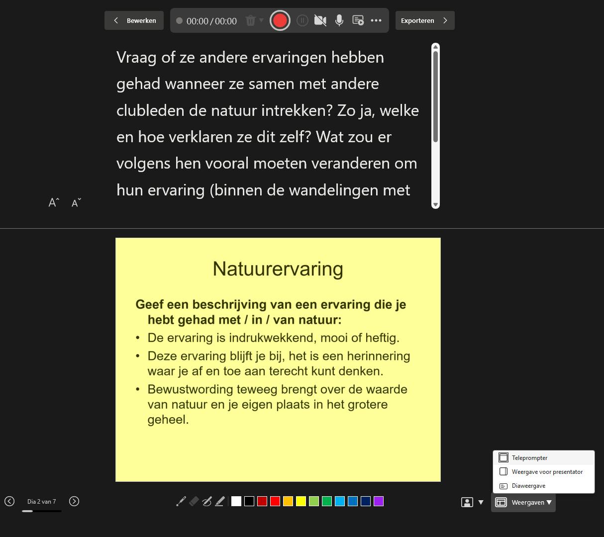 Vlak voor de presentatie open je het tabblad Diavoorstelling, klik je op Monitors en stel je Monitor in op Automatisch. Ga daarna naar het tabblad Opnemen en kies Vanaf het begin. Onder Weergaven, onderaan, selecteer je Teleprompter. Zo krijg jij (als enige) de notities bij elke dia te zien.