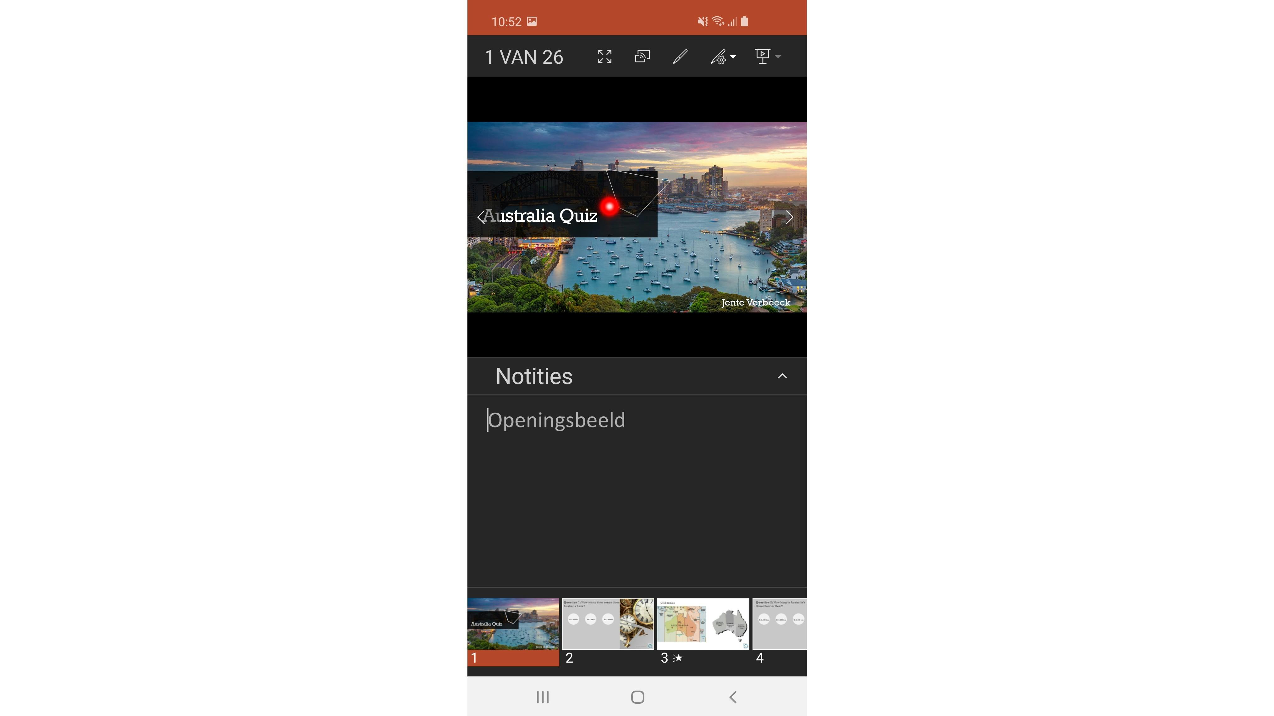 Je kunt je PowerPoint-presentatie ook vanaf je smartphone geven. Installeer de PowerPoint-app en start de presentatie. Tik op het schermpictogram (Weergave voor presentator). Bovenaan verschijnt de eigenlijke dia en onderaan kun je door de dia’s navigeren. In het midden wordt het notitievenster getoond, dat alleen jij kunt zien. Je kunt hier op elk moment nog tekst invoeren, maar als je hier je vinger op houdt, verschijnt er een laserpointer op de dia die je kunt aansturen via telefoonbewegingen. Je dient je smartphone wel met de beamer te verbinden, zoals via een HDMI-adapter of draadloos met AirPlay, Chromecast of Miracast.