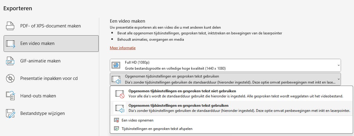 Wil je je presentatie als video beschikbaar stellen, ga dan naar Bestand en kies Exporteren. Je ziet hier opties als PDF- of XPS-document maken, Presentatie inpakken voor cd, Hand-outs maken en Een video maken. Kies deze laatste en stel de resolutie in (van 480p tot 4K). Blijkt de optie Opgenomen tijdsinstellingen en gesproken tekst gebruiken, niet beschikbaar en wil je dit, dan kies je voor Een video opnemen en kun je, eventueel met camera en microfoon, alsnog een opname maken. Bevestig met Video maken en sla de video op als mp4 of wmv. Je kunt deze altijd nog converteren met bijvoorbeeld het gratis HandBrake.