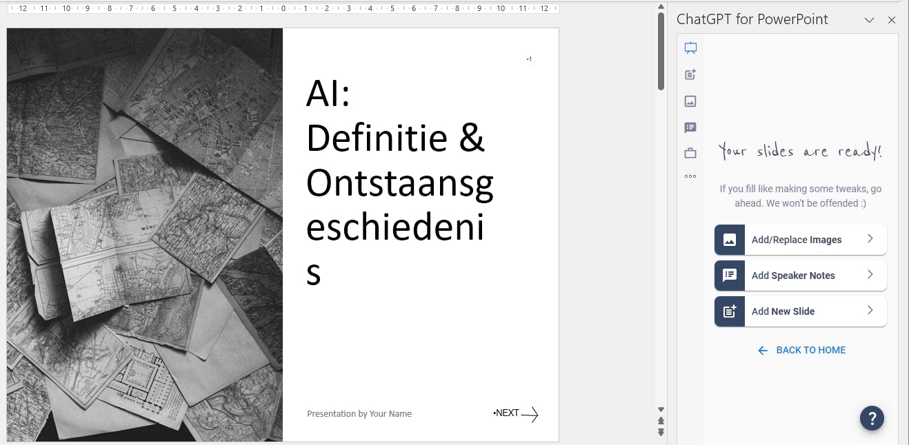 Met deze laatste kun je AI gebruiken om je presentatie te helpen samenstellen. Je beschrijft je onderwerp uitgebreid of selecteert een (video)bestand, kiest de presentatietaal evenals een sjabloon. Het ontwerp is vervolgens snel klaar. Deze add-on kun je vijf keer gratis gebruiken met een maximum van zeven dia’s per keer.