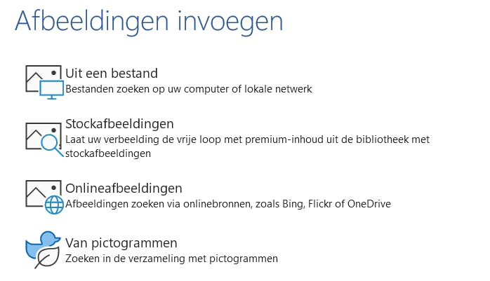 Het is in Word-formulieren ook mogelijk om als ontvanger een afbeelding toe te voegen. In onze taartenactie geven we 1 euro korting aan mensen die een enthousiaste foto van zichzelf toevoegen. Gebruik hiervoor het Inhoudsbesturingselement voor afbeeldingen. De ontvanger kan dan een foto plaatsen op vier manieren: uit een bestand op de computer of netwerk, een stockafbeelding, een onlineafbeelding (Bing, Flickr of OneDrive) of pictogrammen. Voor ons doel is alleen de eerste optie interessant.