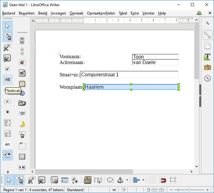 Download en installeer de nieuwste versie van LibreOffice en start tekstverwerker Writer op. Open het menu Beeld en ga naar Werkbalken. Zorg dat de optie Formulierbesturingselementen is geselecteerd. Er verschijnt nu een (verplaatsbare) werkbalk. Klik helemaal bovenaan deze balk het knopje Ontwerpmodus aan. In deze modus kun je ook de besturingselementen op deze balk selecteren. Tik nu wat tekst in je lege document in, zoals Voornaam:, Achternaam: Adres: enzovoort. Vervolgens selecteer je het besturingselement Tekstvak, waarna je achter de benoemde velden in je document een kadertje van de gewenste grootte tekent. Je kunt nu de werking van je formulier gelijk uittesten, dan moet je tijdelijk de Ontwerpmodus weer uitschakelen door dat knopje nogmaals aan te klikken.