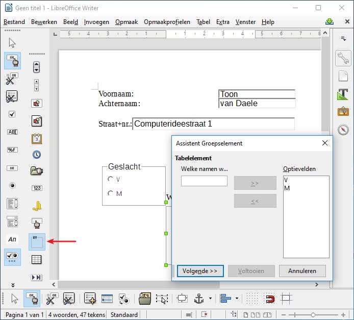 Naast tekstvakken zijn er ook andere veldtypes beschikbaar, waaronder Numeriek veld, Valutaveld, Tijdveld en Datumveld. Die komen beschikbaar wanneer je via de knop Meer besturingselementen een extra venster zichtbaar maakt. In dit venster vind je ook het element Groepsvak terug. Dat is zeer handig wanneer je keuze-opties wilt geven, zoals M(annelijk) of V(rouwelijk). Selecteer dit element en trek een kader. Vul V in en druk op >>. Herhaal dit voor M. Druk op Volgende en kies Nee, geen veld selecteren. Druk nogmaals op Volgende (2x) en geef het vak de naam Geslacht mee. Rond af met Voltooien. Test de werking van je groepsvak uit. Je zult zien: zodra je M selecteert, verdwijnt het bolletje naast V en omgekeerd.
