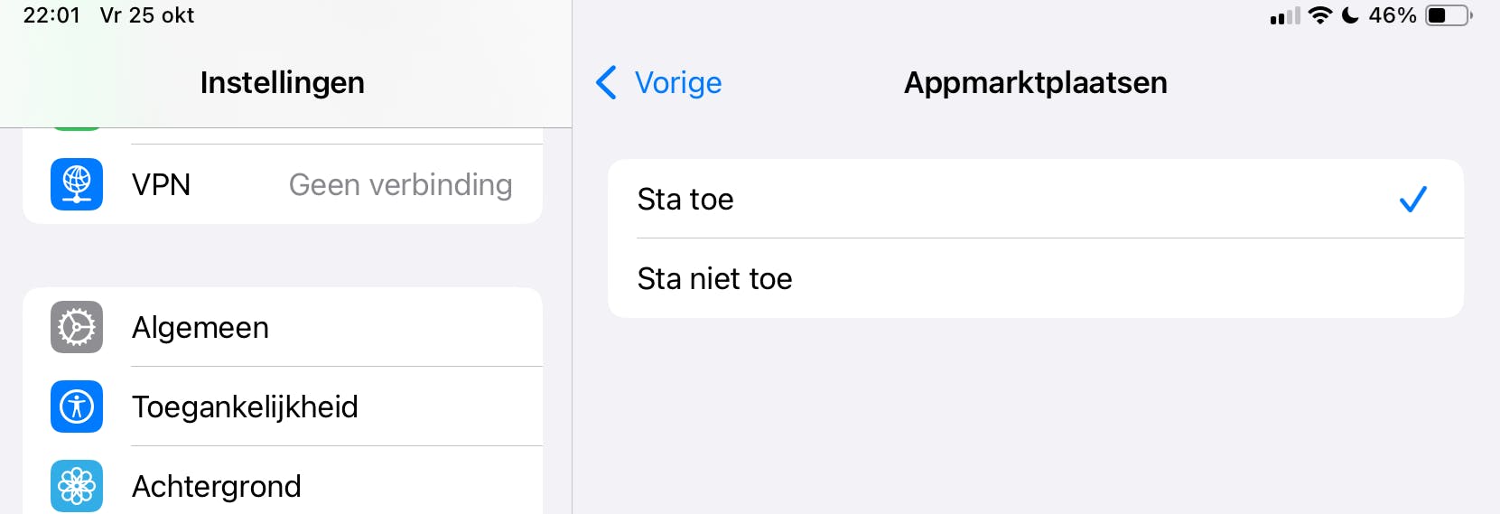 Keer nu terug naar de instellingen van de iPhone of iPad. Linksboven in het instellingenscherm vind je een notificatie waarin wordt gevraagd om je toestemming. Hier staat bijvoorbeeld Sta apps van [naam appstore] toe. Tik op deze melding. Een nieuwe melding verschijnt met aanvullende informatie over de appstore. Lees het geheel door, zodat je op de hoogte bent van de voorwaarden. Tevreden? Tik op Toestaan.