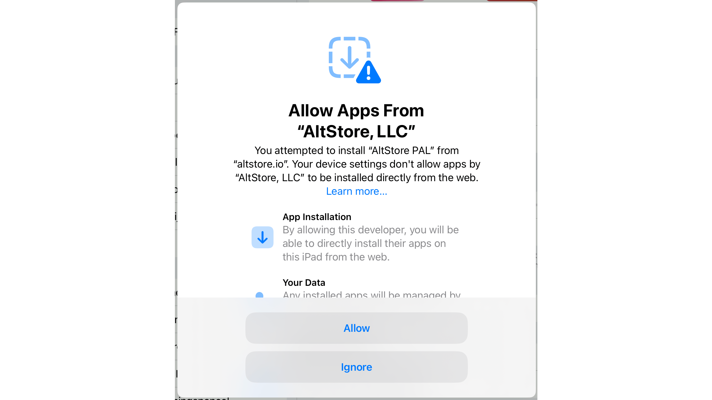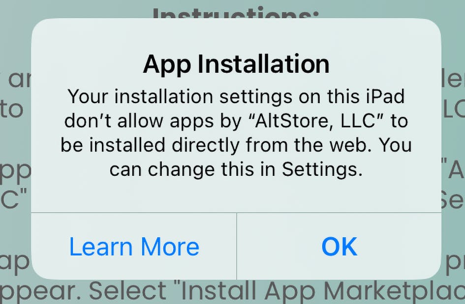 Open nu de browser en surf naar de website van de alternatieve appstore. Gebruik hiervoor Safari, ook als je normaal gesproken een andere browser gebruikt. Tik op de installatiekoppeling. Een pop-upmelding verschijnt, waarin je leest over de alternatieve appstore en Apple meldt dat je geen appstore mag installeren.