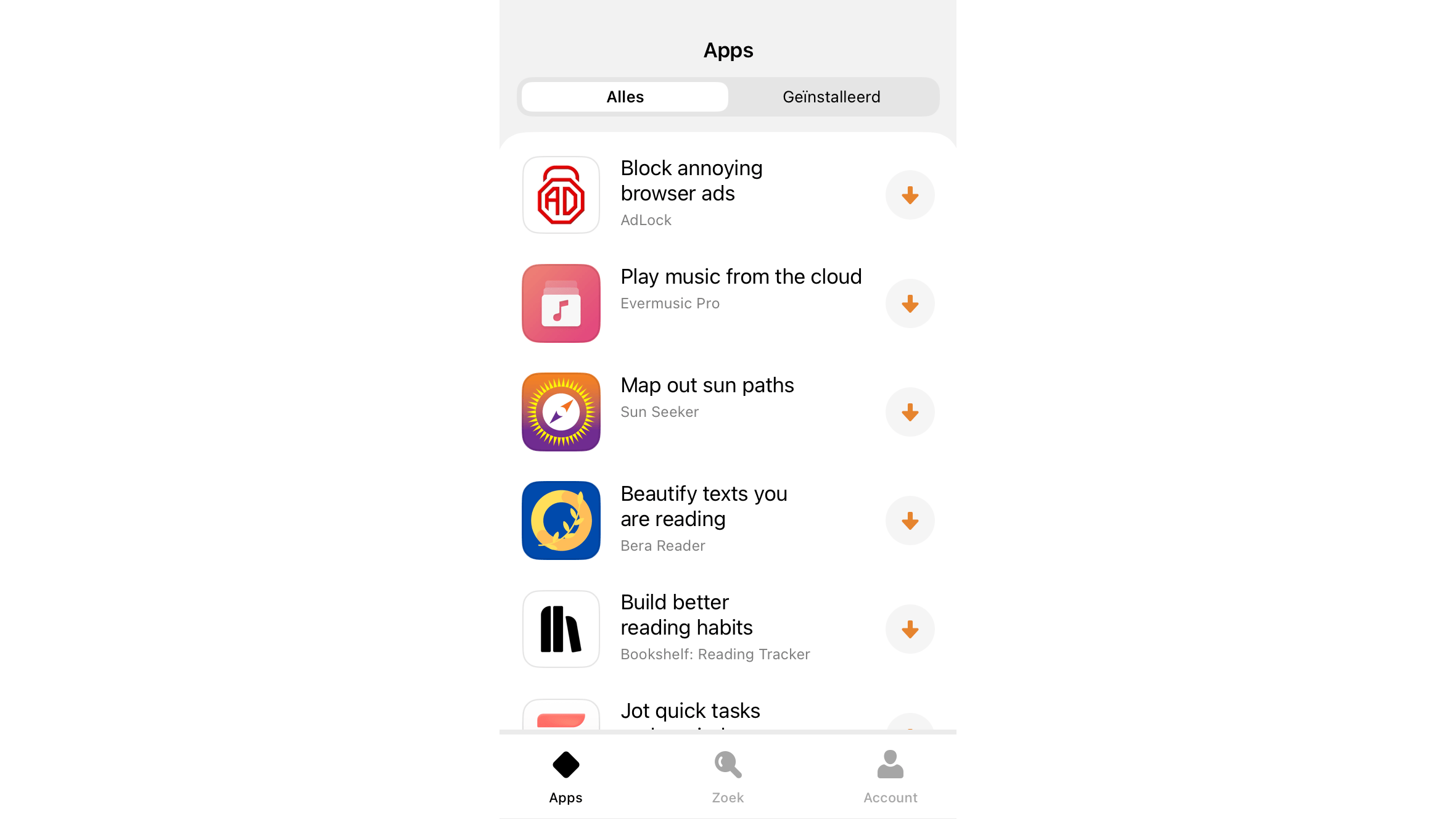 Setapp, van maker MacPaw, is een alternatieve appstore met een uitgebreide collectie. Dat is niet zo vreemd: de aanbieder bestaat al langer en biedt voor Mac-gebruikers voor de desktop een ‘abonnement’ waarbij je voor een vast bedrag per maand (ongeveer 10 euro) de apps onbeperkt mag gebruiken. Een deel van de apps is ook toegankelijk via de mobiele appstore. Werp een blik op de tab Apps: hier vind je de collectie.