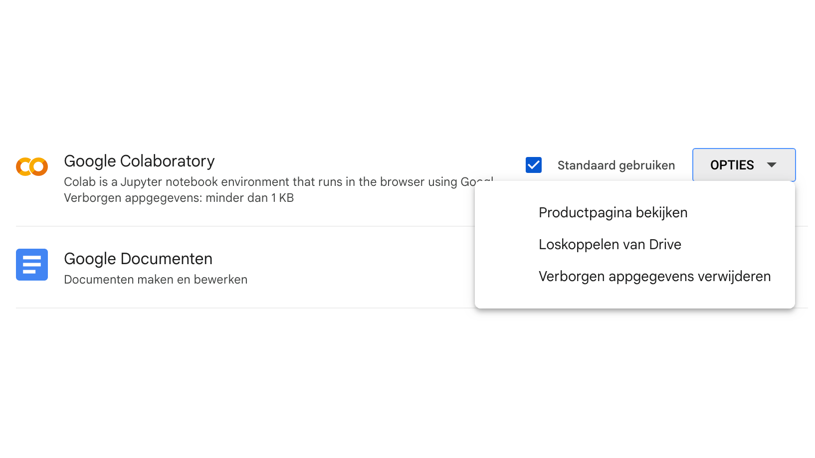 Google Drive koppelt met verschillende apps van derden die gegevens kunnen opslaan in de cloud. Het is verstandig om die apps te controleren. Selecteer het tandwielpictogram bovenaan en kies Instellingen. Vervolgens gebruik je de opdracht Apps beheren. Kijk bij de Opties van de apps of je de opdracht Verborgen app-gegevens verwijderen kunt gebruiken. Herhaal deze stap voor elke app waarvan je de gegevens wilt verwijderen.