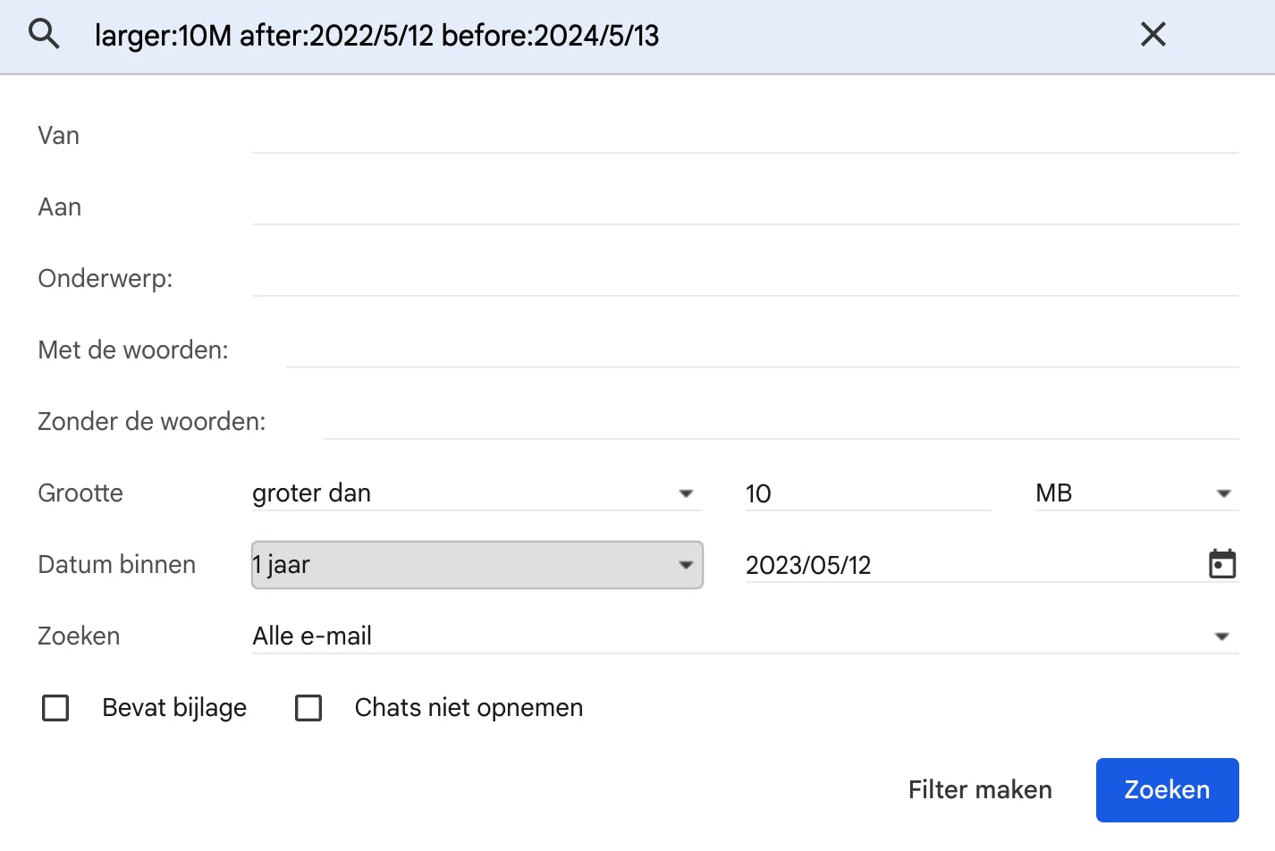 Ten slotte is het de moeite waard om de inbox in Gmail te controleren om te zien of daar grote bijlagen in zitten. Gebruik het pictogram Zoekoptie weergeven naast Zoek in het postvak. Selecteer de optie Groter dan in het vervolgkeuzemenu Grootte en voer een maat in, bijvoorbeeld 10 MB. Op die manier krijg je de mails te zien die meer dan 10 MB in je account verbruiken.