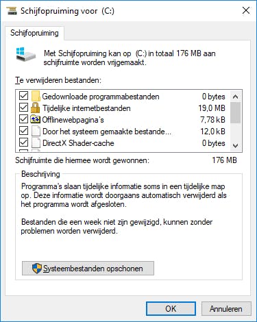 Als jouw computer geschikt is voor de Fall Creators Update, kun je van start. Je doet er van tevoren verstandig aan om eerst je oude bestanden te verwijderen. Windows heeft daar zelf ingebouwde functies voor, zoals Schijfopruiming. Deze tool vind je door het woord Schijfopruiming in te typen in het startmenu. Kies bij het starten van Schijfopruiming voor de C:-schijf en klik op OK. Vervolgens druk je onder in het venster op de knop Systeembestanden opschonen. Het programma wordt eerst eenmaal opnieuw gestart, maar daarna krijg je een hele rij aan opschoonlocaties te zien. Je kunt nu gerust alle opties aanvinken om er zeker van te zijn dat alle overbodige bestanden worden verwijderd. Klik op OK om het opschoonproces te starten.
