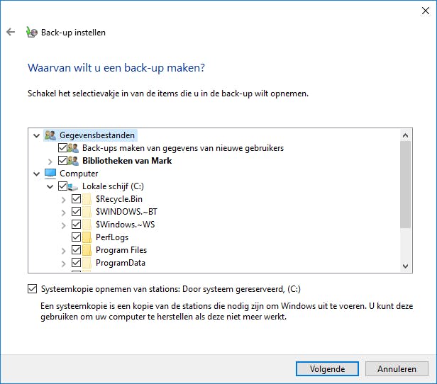 Klik op de knop Volgende en meteen ziet je welke onderdelen er worden geback-upt. Je kunt zelf kiezen welke (extra) partities je in de back-up wilt opnemen, maar aangezien het hier alleen om een Windows 10-back-up gaat, kies je voor de C:-schijf, de gegevensbestanden en zet je een vinkje bij de optie Systeemkopie opnemen. In dat laatste geval worden namelijk ook de opstartpartities meegenomen in de back-up zodat je – na het terugzetten ervan – snel weer kunt opstarten. Klik op Volgende en het proces begint.