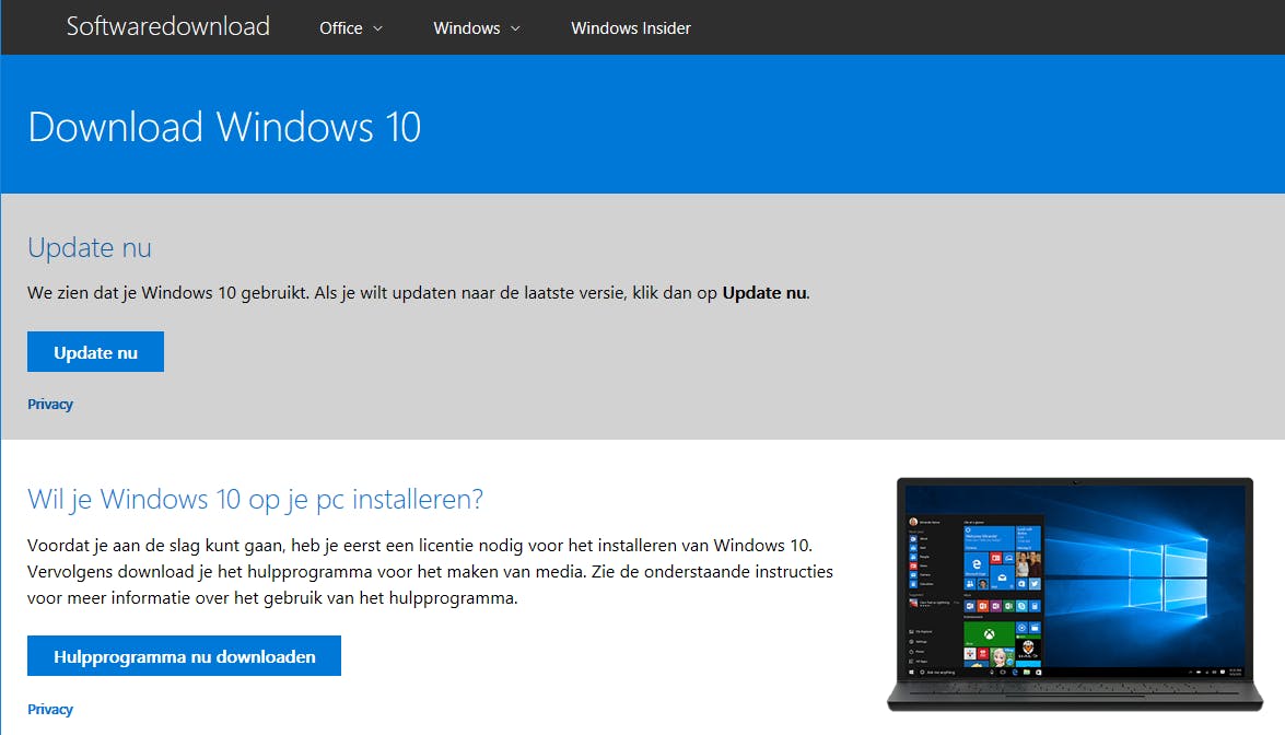 Als je Windows 10 al sinds de beginperiode gebruikt en je merkt dat het systeem niet meer helemaal lekker draait, dan kun je ervoor kiezen om een schone installatie van Windows 10 uit te voeren. Dat kan via de Media Creation Tool, die je op de genoemde pagina downloadt via de link Hulpprogramma nu downloaden.